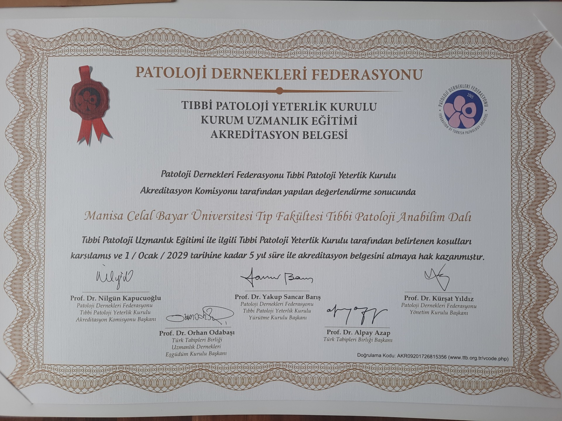 Tıp Fakültesi Tıbbi Patoloji Anabilim Dalı; Patoloji Dernekleri Federasyonu Tıbbi Patoloji Yeterlik Kurulu Akreditasyon Komisyonu Başkanlığı tarafından 01.01.2024 tarihinden itibaren Tıbbi Patoloji Anabilim Dalı Tıpta Uzmanlık Eğitimi 01.01.2029 tarihine kadar beş 5 yıl süreyle ikinci kez edilmiştir.